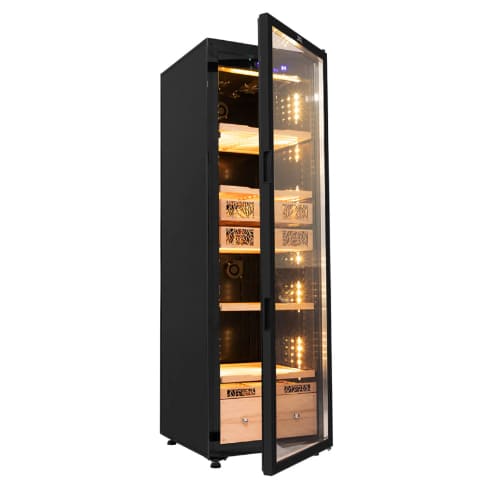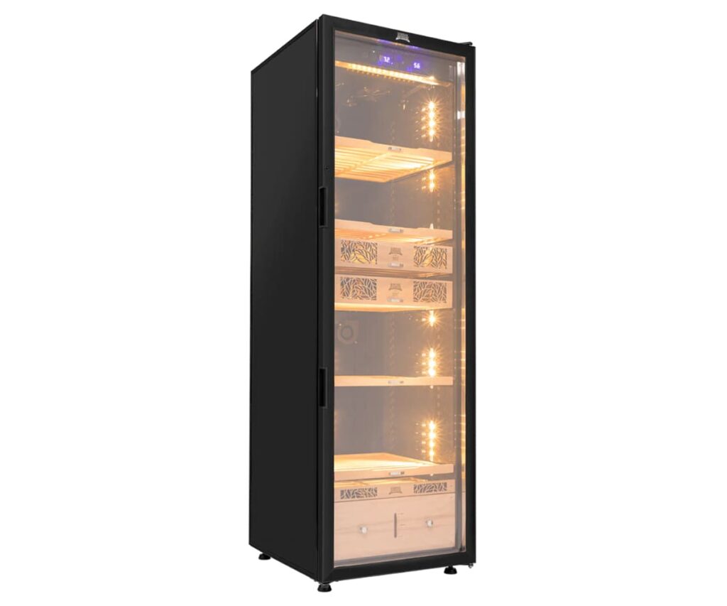 This towering model offers elite-tier cigar storage with precision climate control and a whopping capacity of 2,000 to 2,500 cigars.